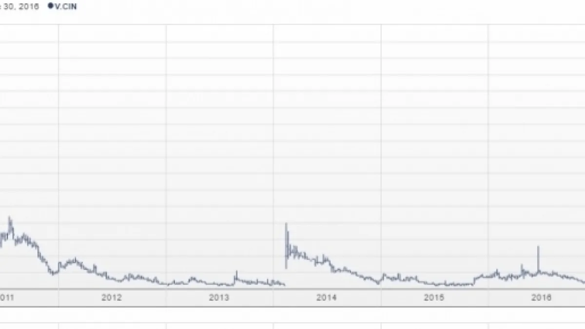 Canadian International Minerals Inc. (TSXV: CIN) completed a one-for-10 consolidation in February 2014 that appears to be missing with Stockhouse. Data with the TSE agrees with data from BigCharts, which appears to be error free.