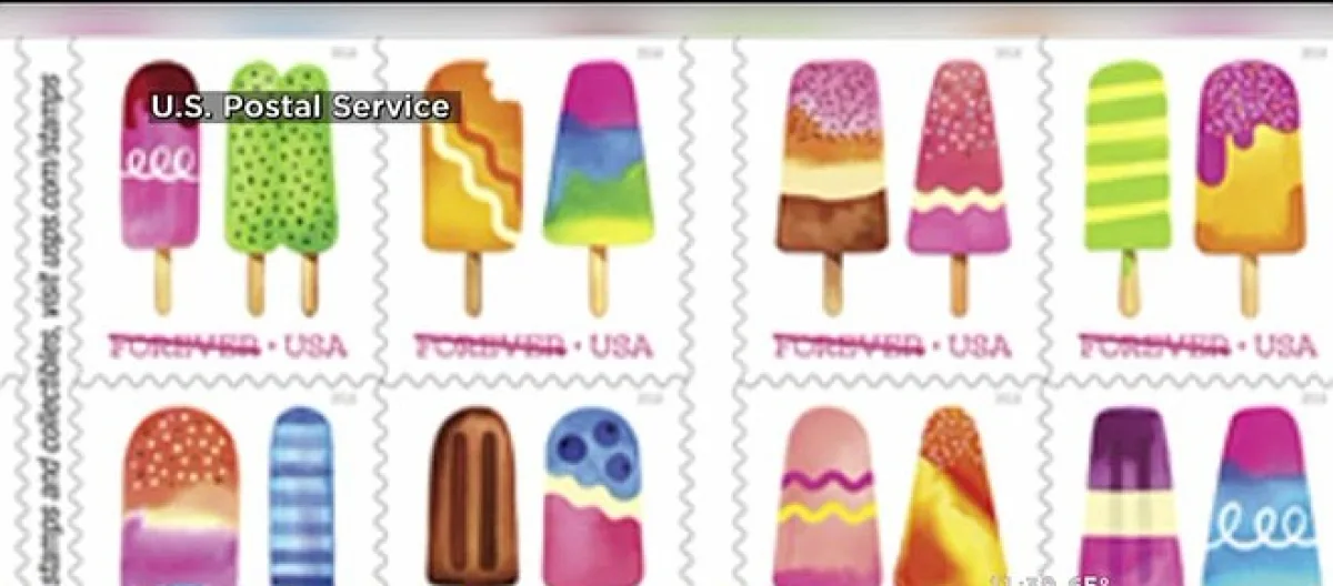 Each of the ten Frozen Treats Forever stamps is different and will be available on June 20. The stamps feature a watercolor photo of two different popsicles featuring the artwork of Santa Monica, California native Margaret Berg. They were designed by the Postal Service art director Antonio Alcalá and designer Leslie Badani, both of Alexandria, Virginia.