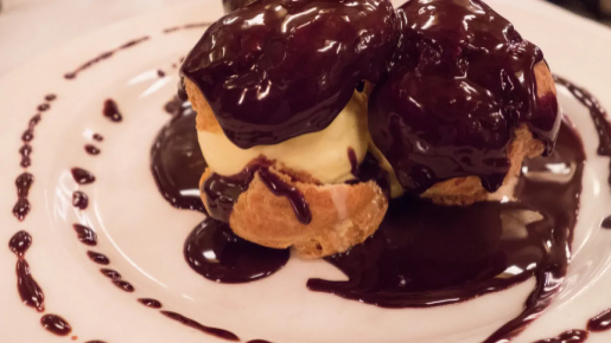 The pastry is cooked in a saucepan consisting of flour, eggs, milk/water and butter in a 1:2:2:1 ratio. It's then piped out of a bag in little balls of dough onto baking trays and baked off to perfection. From there, they can be filled and topped with a variety of dessert sauces.