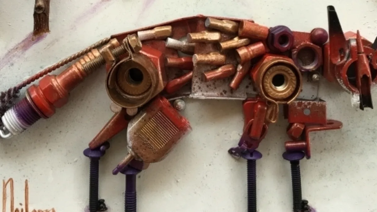 A blend of sculptural and painting worked onto a canvas for a 3D effect using spray paints, sometimes stencils, and some acrylics. I’m a big fan of the Steampunk genre, and I would say that has had some influences with the found objects being so appealing to work with. I have an affinity toward animals, which are represented a lot in my works. However, I have done other represented things like a train, a mechanical heart, and a series of art deco style female figures for example.