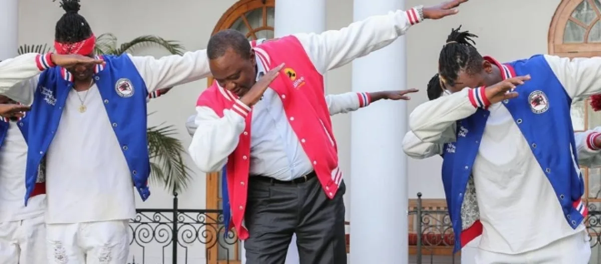 Kenyans on twitters (KOT) took their war to the doorsteps of Kenyan State House attacking President uhuru kenyatta following a viral photo in which the president was dabbing with FBI dance crew. A local dance crew had paid the president a courtesy call to shoot a dance video aimed at sensitizing the youth to come out in their numbers and register as voters in the ongoing mass voter registration .