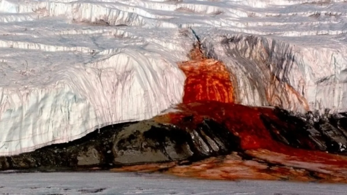 It turns out that Taylor Glacier is sitting atop an ancient network of flowing water. Essentially, it's a lake that exists underneath the ice of a huge glacier. The water remained a liquid not because of its iron, but its salt concentration.