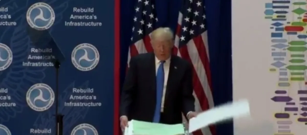 While speaking to the Transpiration Department in Washington on Friday, Donald Trump addressed his plans for infrastructure investment, but the situation got out of hand when he started throwing around binders on stage. "It is a long, slow, unnecessarily burdensome process," Trump said in regards to the process of obtaining permits to building in the United States.