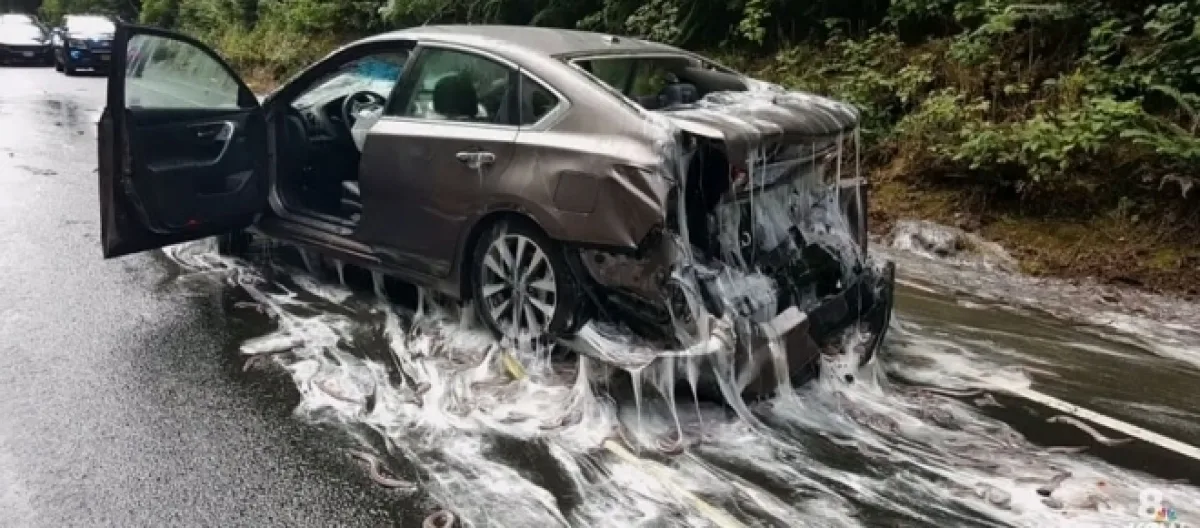 A disgusting scene unfolded on US 101 on Thursday when a truck full of “slime eels” overturned, shedding its slimy and gooey load all over the highway. Five cars were involved in the resulting pileup as they skidded on the goo, while fish were thrown over vehicles and the road.