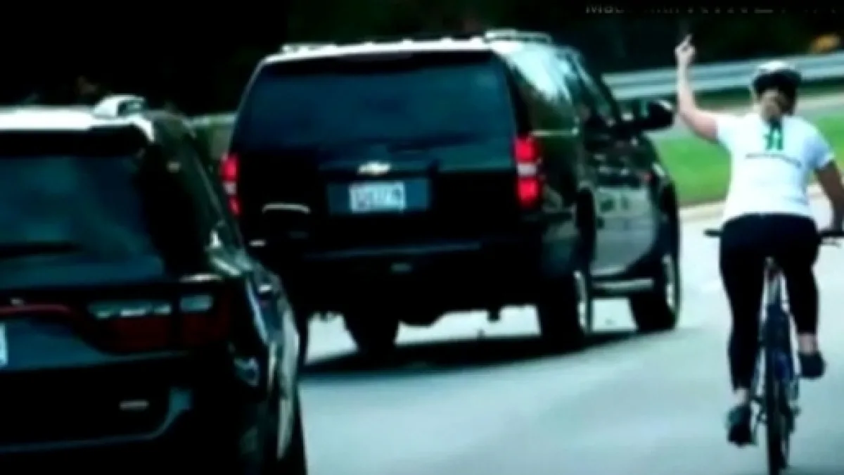 When the president’s vehicle had to stop at a traffic light before turning left on to the parkway, the cyclist finally caught up. Reporters stated that the woman was riding in the right lane outside the golf club and was seen to be repeatedly extending her middle finger towards the president.