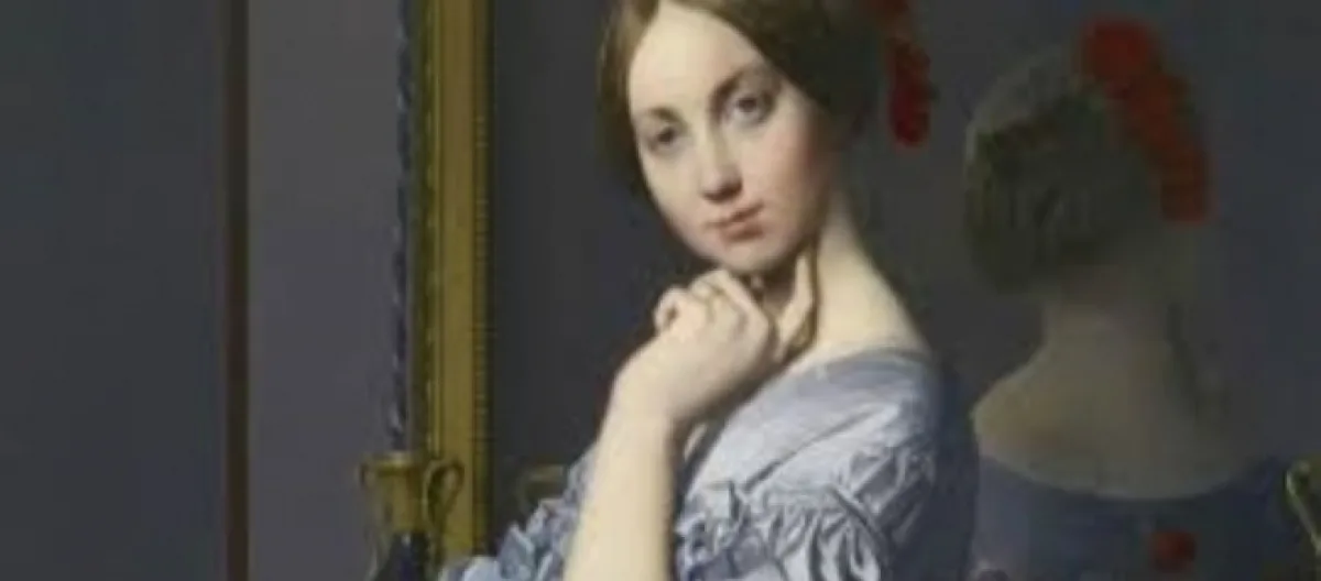 Ingre was big on the simplicity of line, the kind you see in engravings – sharp and clear. And to master form, he made it a practice to study ancient art – statuary in particular -- which may account for why the skin in his portrait come across as slick and smooth as marble statues. But all that classicism aside, there’s something else not always mentioned, not only about Ingre’s portrait, but also about David’s portrait: the women in their paintings are portrayed as thinking figures who look out at us if to ask if we’re thinking people, too. And David’s “Portrait of Madame Riviere” is like Ingre’s for its stark simplicity; although he goes further and omits all background detail.