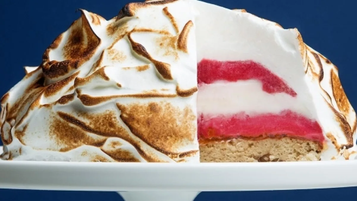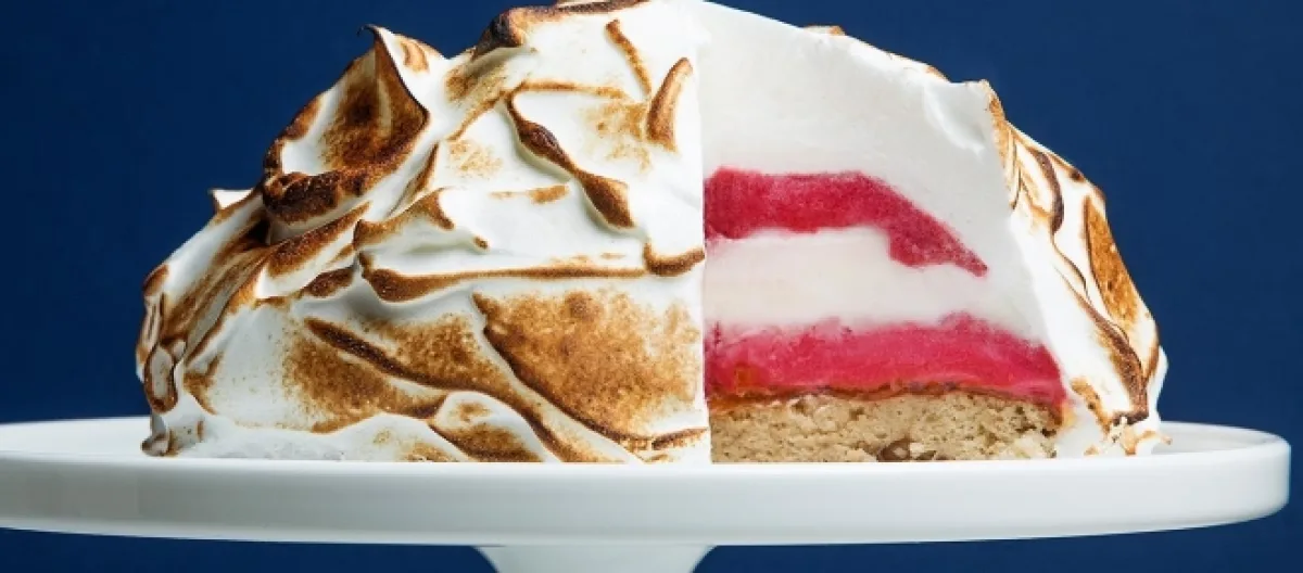 A #baked Alaska is a traditional dessert that has cake topped by a layer of ice cream, which is then drenched in meringue and baked with a torch. Let's get facts straight first.