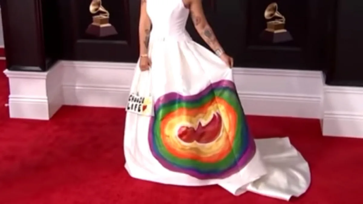 There are always a few attendees at the Grammy Awards each year who wear outfits that bare almost all of their flesh so this year was no different. Pink's feather duster outfit was considered quite bad by most, but Joy Villa took bad taste to an entirely different level, by wearing a dress with an unborn fetus on it to emphasize her pro-life stance.