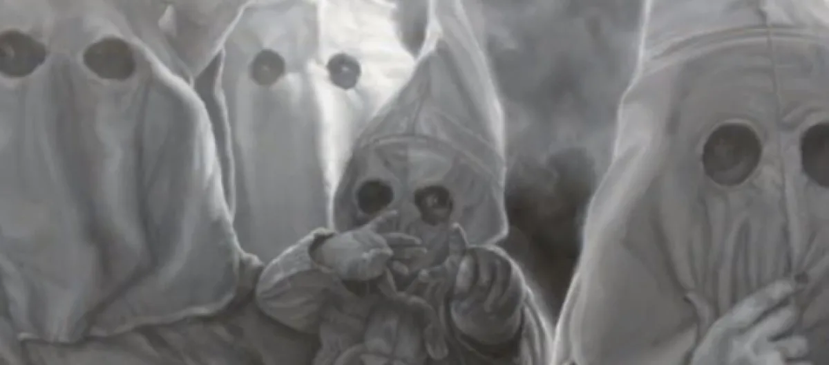 The Blanton Museum in Austin, TX reports a purchase of a 30-foot long painting that views the KKK in an unusual way. The Guardian reported that it will hang in the Blanton Museum of Art, at the University of Texas at Austin from Tuesday. Instead of lynchings and burning crosses, you get a casual, moonlit glance at a handful of klansmen loitering by a Chevy Silverado, holding cell phones or cans of beer - not unlike a group of teenagers hanging around a street corner.