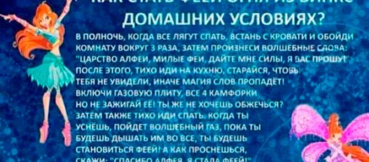 The online scam encouraged children to become fire-fairies like Bloom themselves by casting a spell that involves turning on all four burners of a gas stove and repeating magical words. The spell specifically asks children to perform the ritual at midnight so that no one will stop them. At least one little girl, identified as Sofia Ezhova, was severely burned after trying to cast the spell. Reportedly, one mother claimed her daughter turning on the oven to cast such a spell would have killed her entire family had she not smelled the gas in time.