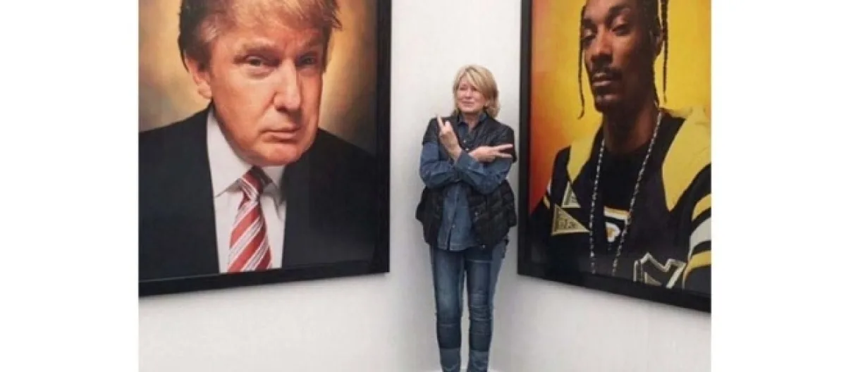 Portraits of Donald Trump and Snoop Dogg by Andres Serrano were included in Frieze Art Fair last weekend on Randall’s Island in New York City, where Martha Stewart happened to be just a casual guest. The two portraits are adjacent to each other, which people interpretted as the two men in Martha Stewart's life. On her Instagram account a post of artist and embroiderer, Tillotson, showed Stewart giving Snoop Dogg a peace sign. On the other hand, in the same photo, Stewart appears to be giving Donald Trump a middle finger.