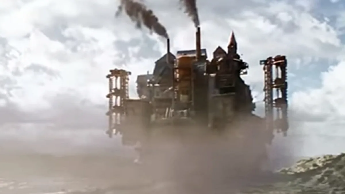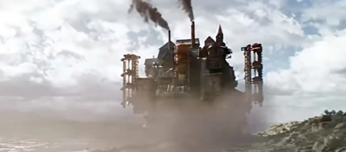 We then see what she sees which is a giant machine moving fast toward them. The camera glides over the top of the machine, revealing the green gardens and city life on it. If you look closely you can see "Big Ben" on the machine. The main character also states that it is London that's chasing them. Now if you have never been to London, it is an extremely large city, with a population of 8.3 million people. It has now been shrunk down to this machine and obviously, not everyone can fit in it. The London machine chases the smaller machine until it finally gets it and pulls it inside.