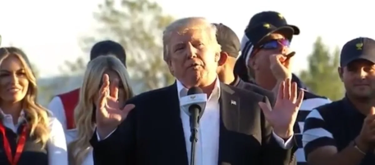 On Sunday, Donald Trump was in New Jersey for the President's Cup golf tournament, and took part in presenting the trophy to the winners. The former host of "The Apprentice" gave a short speech where he went on to dedicate the trophy to the hurricane victims in Puerto Rico.