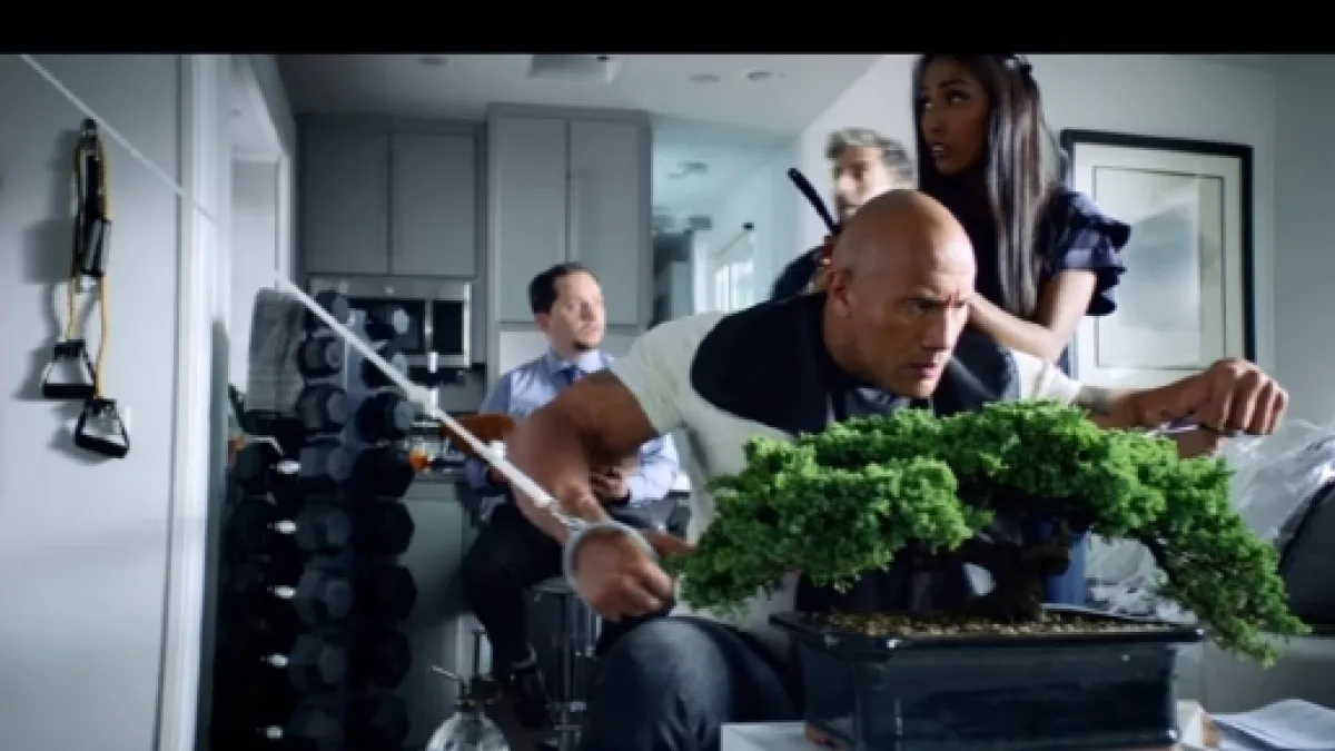 We see Johnson on the set of a sci-fi alien invasion flick, relaxing between takes by simultaneously lifting weights, trimming a bonsai and getting his head shaved. When a news report states the opinion of “experts” that the actor can’t squeeze in more activities onto his schedule of projects, Johnson takes his iPhone 7 and gets Siri to plot out a schedule of more stuff to do before he returns to the set. Siri gets him a Lyft ride to LAX; he switches with the driver and drives through a shortcut onto the airport runway. Then he commandeers a domestic flight to get to Rome. And that is only the beginning.