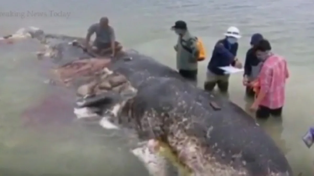 The carcass of a dead sperm whale washed ashore on a beach in Indonesia. It was a massive animal nearly 31-foot in length and there were plastic products in its stomach. These included hundreds of plastics, and most were of one-time use and throw-away types. Wakatobi National Park chief Heri Santoso has said that the carcass was in a rotting condition.